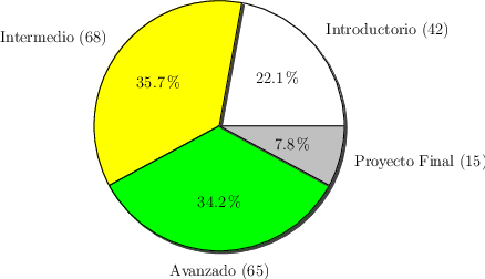 y por niveles de cursos (Introductorios, Intermedios, Avanzados y Proyectos).